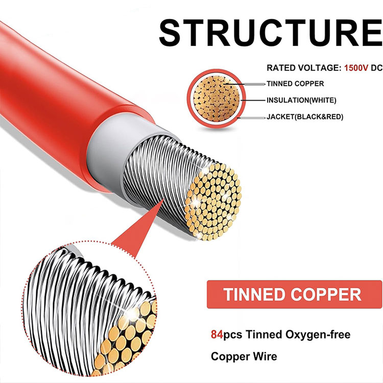 Isolamento durável: Os fios do painel solar são revestidos com materiais de isolamento resistentes às intempéries que podem suportar ambientes agressivos, como radiação UV, umidade e temperaturas extremas, garantindo uma operação estável dos cabos a longo prazo.